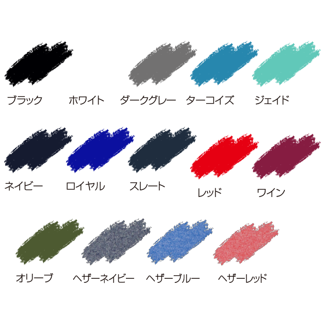 ブラック、ホワイト、ダークグレー、ターコイズ、ジェイド、ネイビー、ロイヤル、スレート、レッド、ワイン、オリーブ、ヘザーネイビー、ヘザーブルー、ヘザーレッド